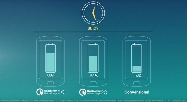 INOV是由Qualcomm Technologies開(kāi)發(fā)的全新算法,旨在幫助便攜設(shè)備具備選定所需功率電平的能力,實(shí)現(xiàn)最佳功率傳輸,Quick Charge 3.0能在大約35分鐘內(nèi)將一部常規(guī)手機(jī)從零電量充電至80%,而不具備Quick Charge的設(shè)備通常需要大致一個(gè)半小時(shí)的時(shí)間。