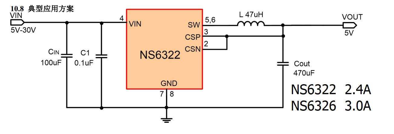NS6322,固定輸出電壓5V,2.4A可調(diào)恒流電流,外圍僅僅電容和電感,高集成,過EMI