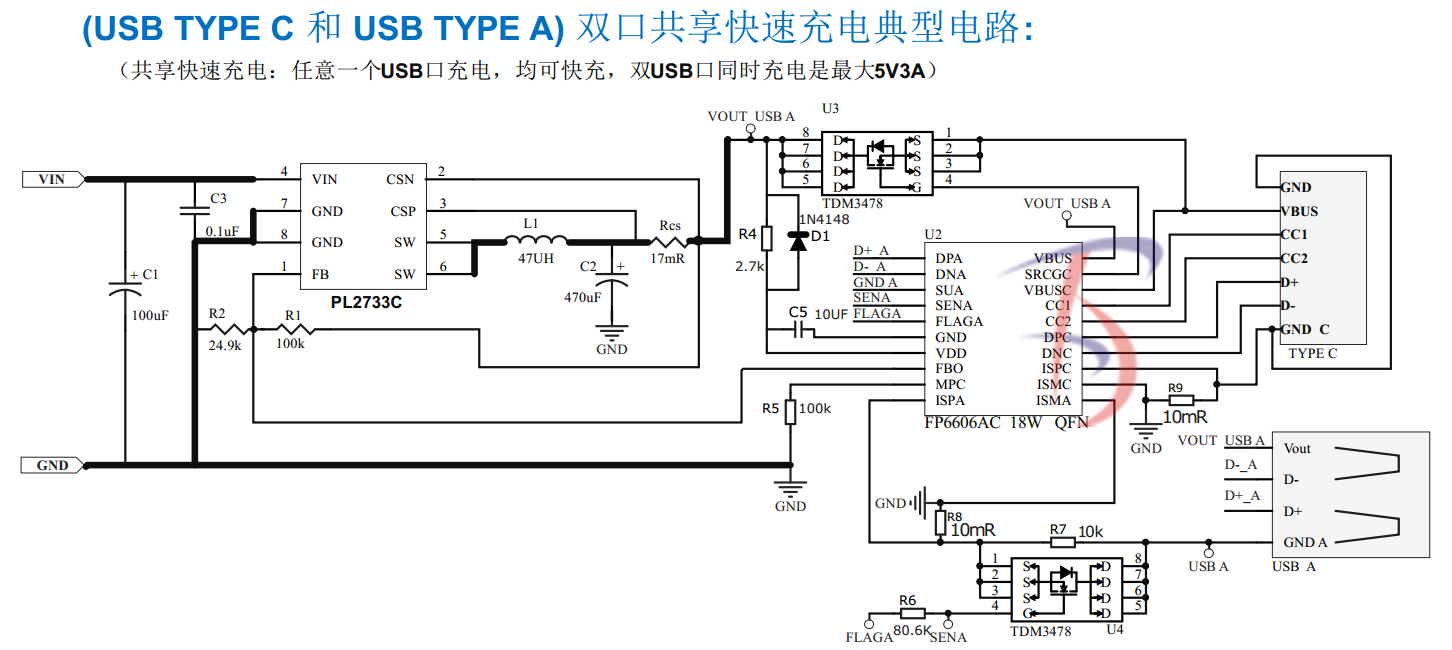 PL2733C +FP6606AC組成(USB TYPE C 和 USB TYPE A) 雙口車充電路: