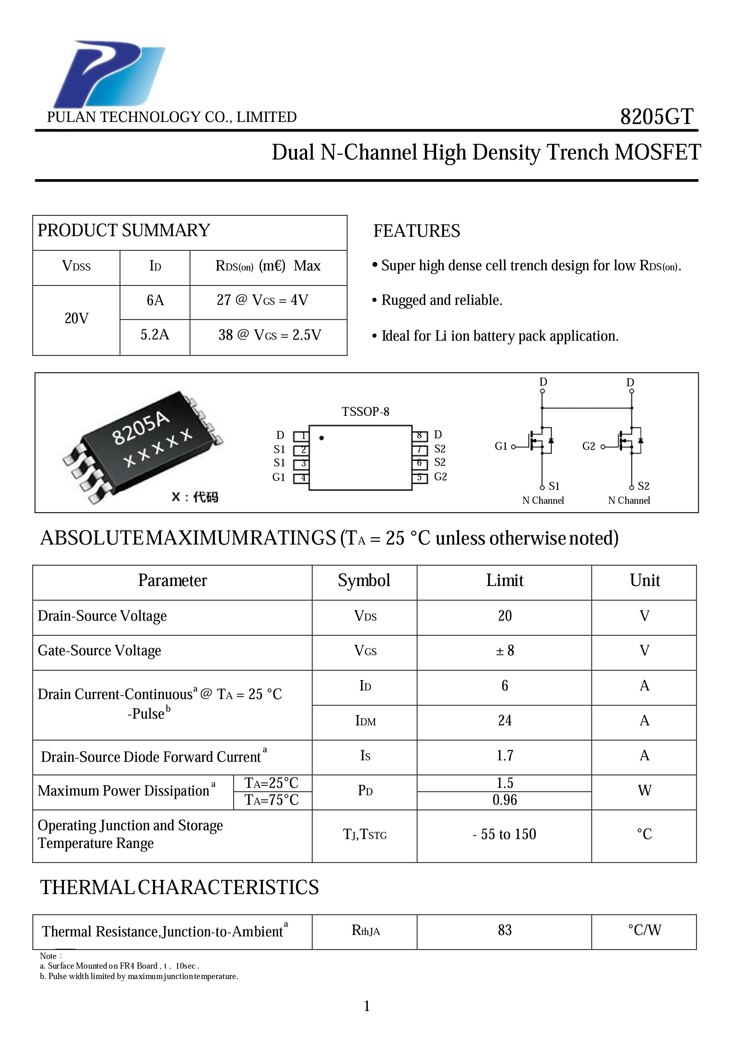 8205有兩種封裝:SOT23-6 (20V 4.3A) TSSOP8(20V 6A) 8205常與DW01鋰電池保護(hù)IC,搭配組成完整的鋰電池保護(hù)電路。 |