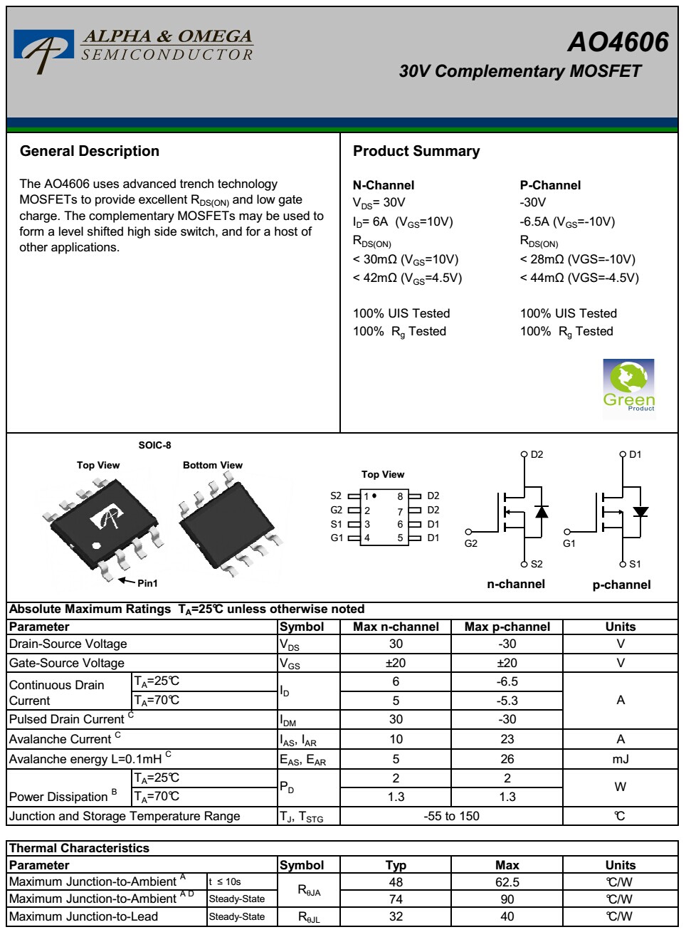 AO4606低內(nèi)阻MOS管 P溝道(-30V -6.5A)+N溝道(30V 6A)