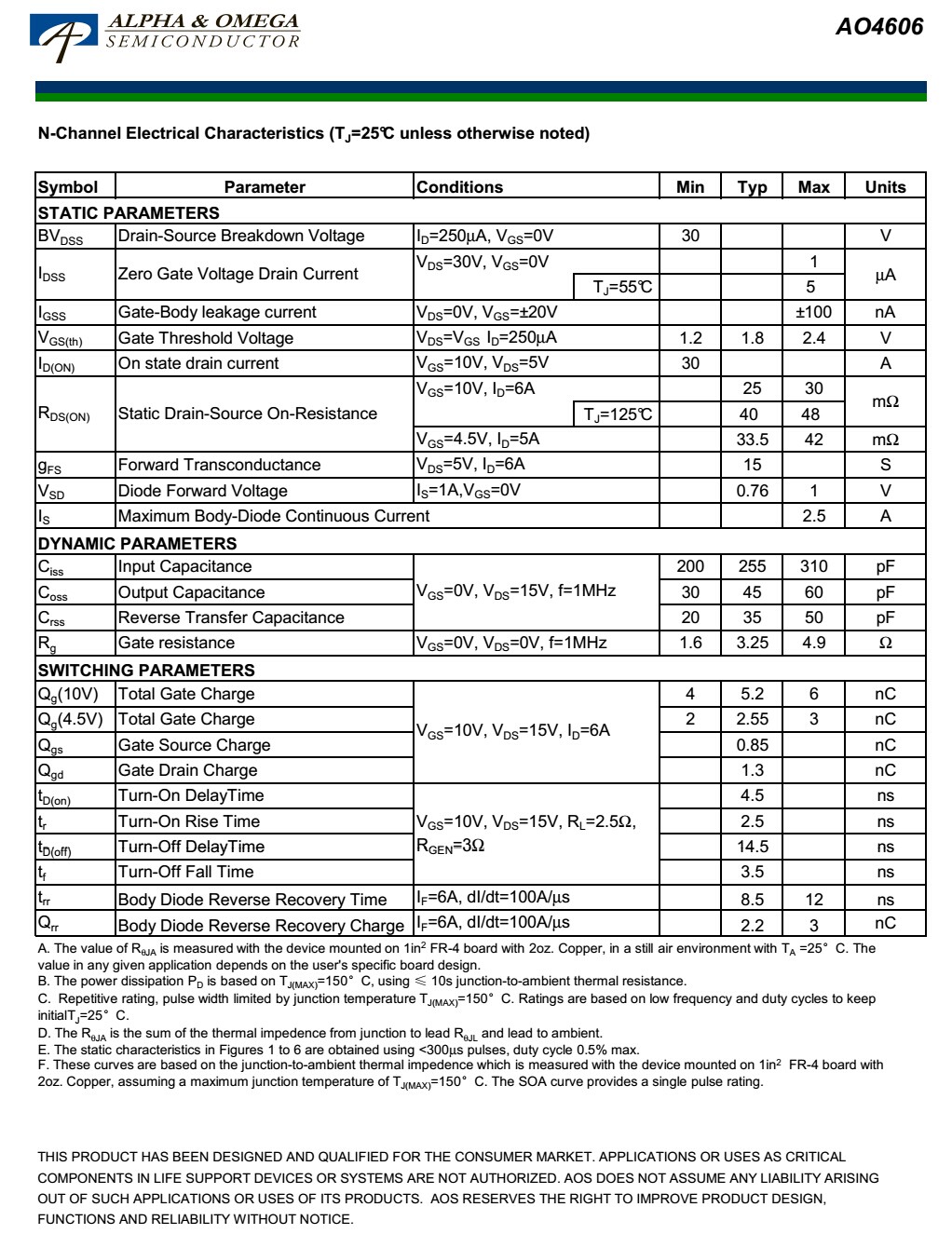 AO4606低內(nèi)阻P溝道(-30V -6.5A)+N溝道(30V 6A)MOS管