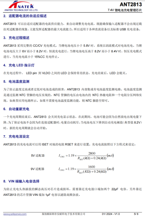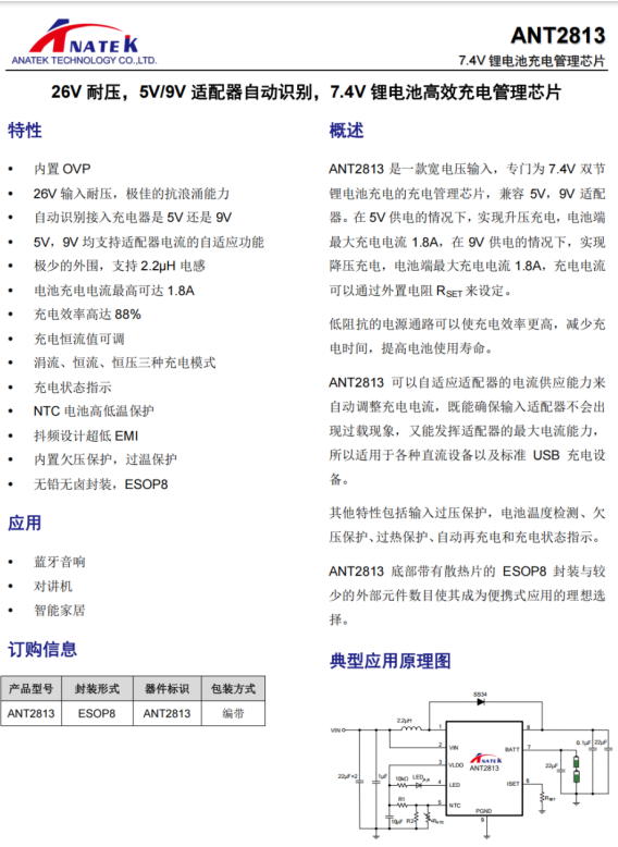 ANT2813 特點(diǎn):7.4V 鋰電池充電管理芯片,自動(dòng)識(shí)別接入充電器是 5V 還是 9V,充電電流1.8A,耐壓26V, 內(nèi)置 OVP/NTC功能,用于指紋鎖、對(duì)講機(jī)、音箱等市場(chǎng),封裝ESOP-8。