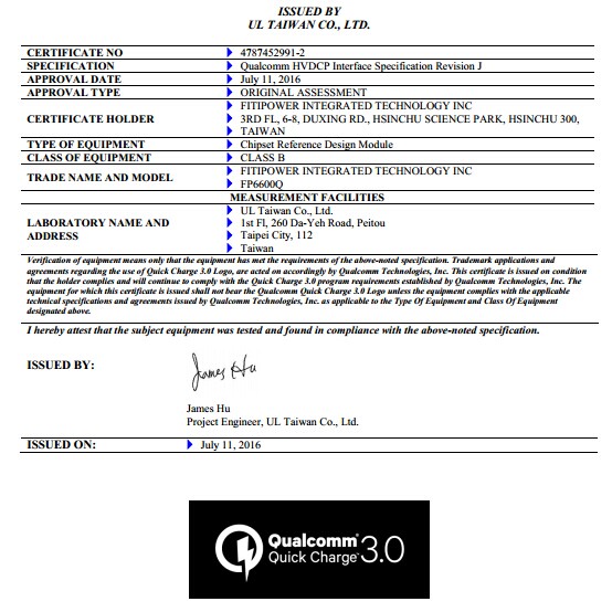 QC3.0高通認(rèn)證證書(shū)-FP6600Q