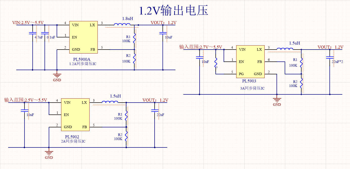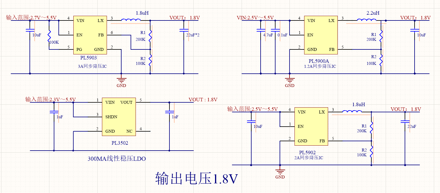 5V降壓1.8V,1.5V,1.2V,在對(duì)于電流,功耗,壓差等等不用需求時(shí),需要選擇不同的芯片來(lái)幫助工程師搭建合適的應(yīng)用電路。