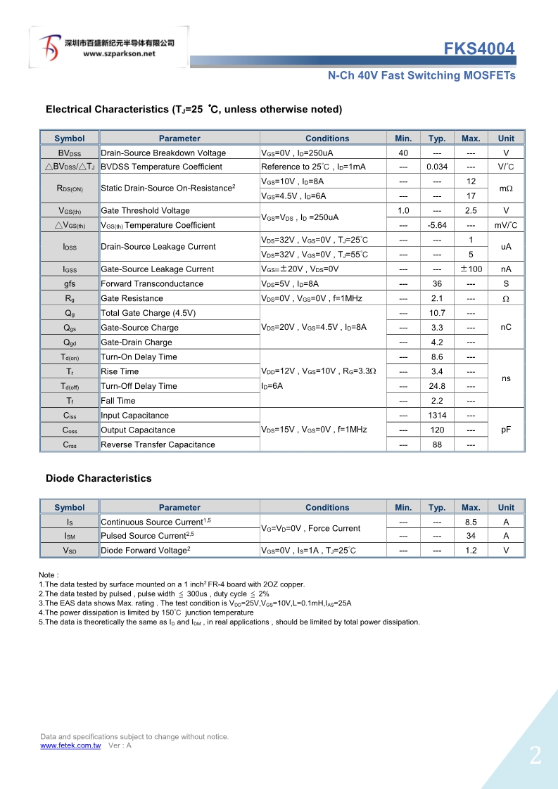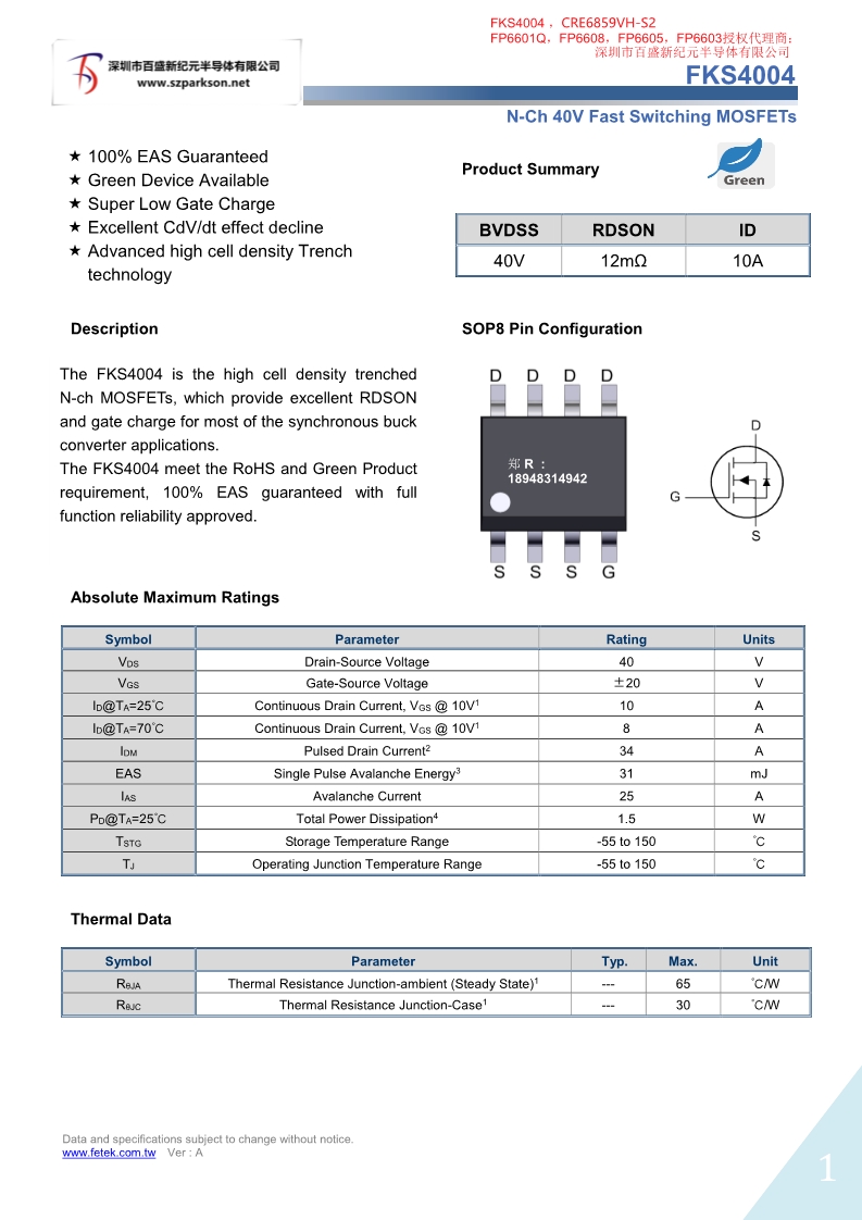 The FKS4004 meet the RoHS and Green Product requirement, 100% EAS guaranteed with full function reliability approved.