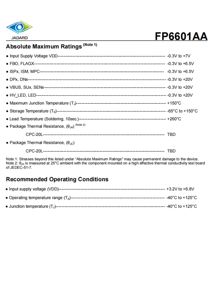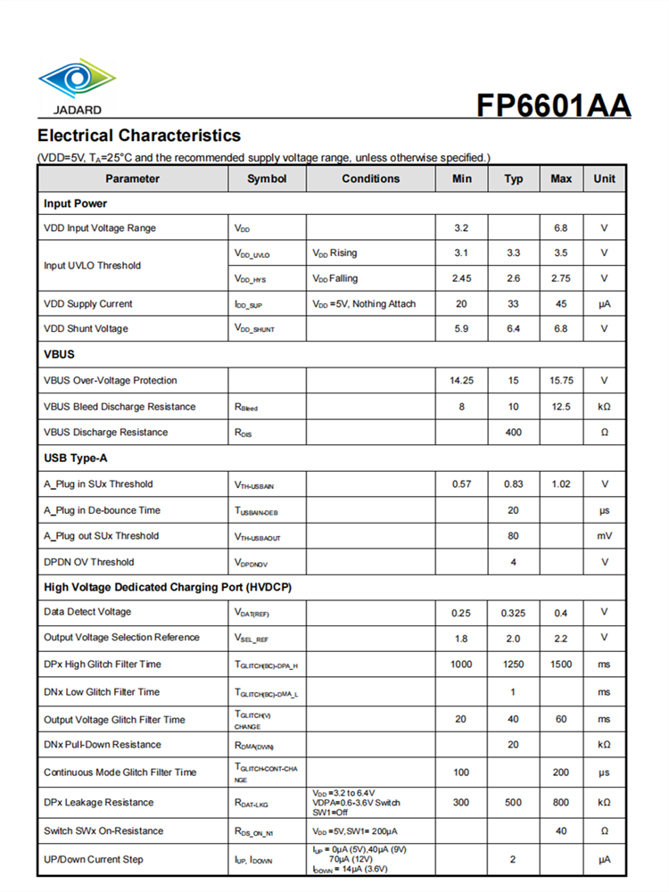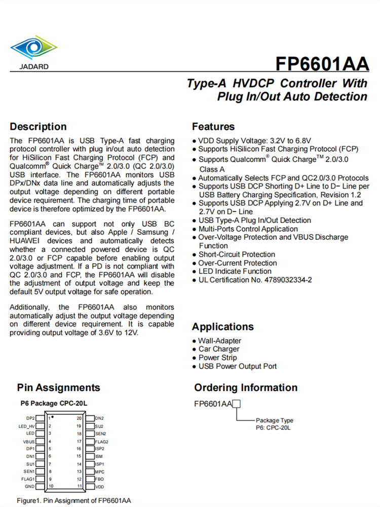 FP6601AA是USB Type-A快速充電協(xié)議控制器,插拔自動檢測HiSiconk快速充電協(xié)議(FCP)和高通®快速ChargeTM 2.0/3.0(QC 2.0/3.0)USB接口。FP6601AA監(jiān)控USB DPx/DNx數(shù)據(jù)線,并根據(jù)不同的便攜式設備需求自動調(diào)整輸出電壓。因此,通過FP6601AA優(yōu)化了便攜式設備的充電時間。