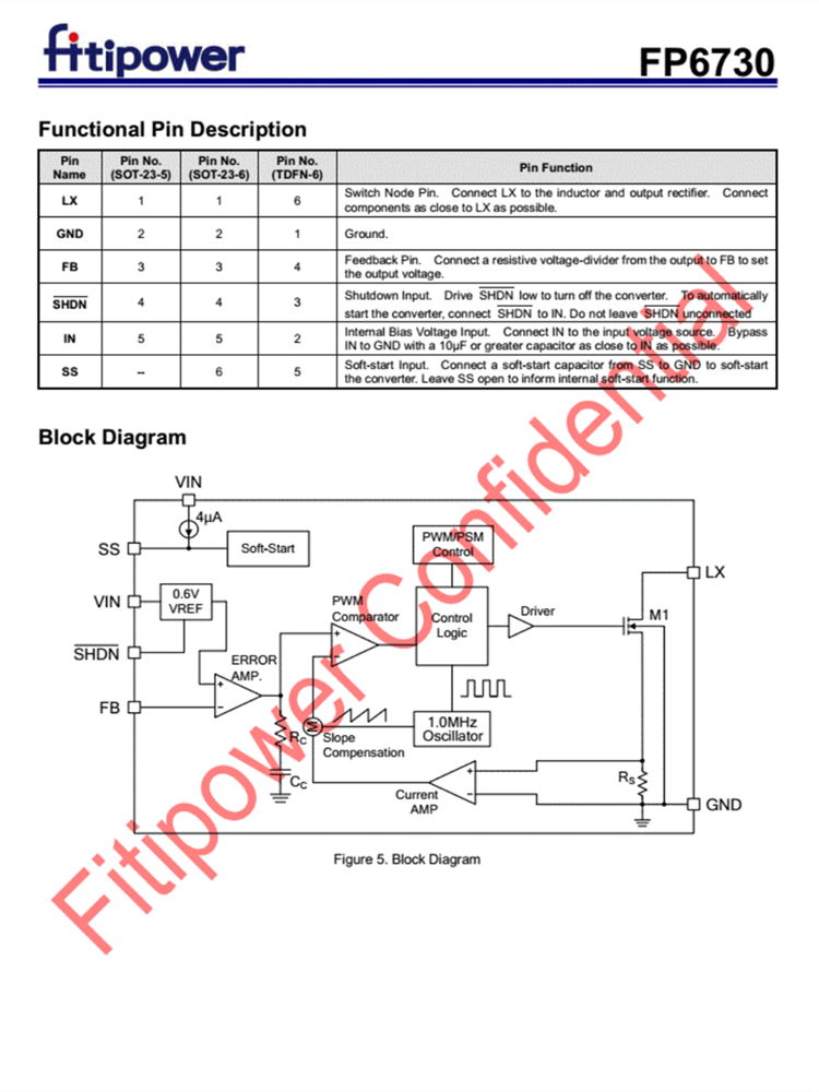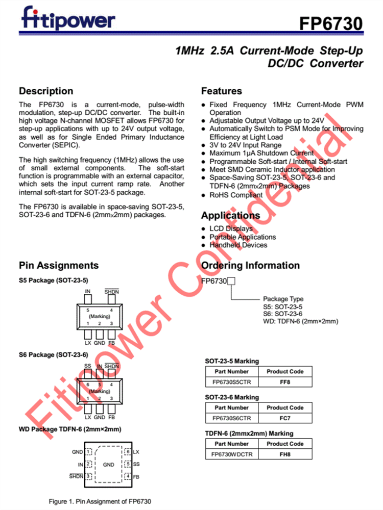 FP6730 采用節(jié)省空間的 SOT-23-5、SOT-23-6 和 TDFN-6 (2mm x 2mm) 封裝。