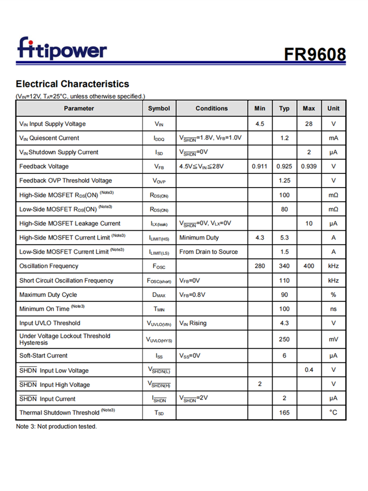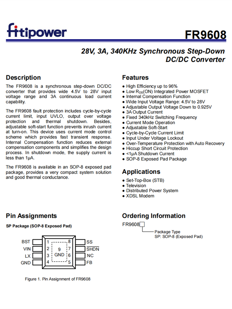 FR9608是一個(gè)同步降壓直流/直流轉(zhuǎn)換器,提供廣泛的4.5V到28V輸入電壓范圍和3A連續(xù)負(fù)載電流能力。