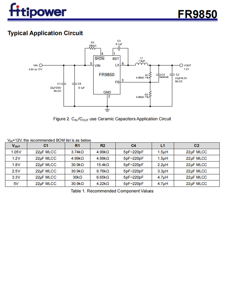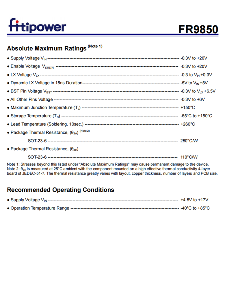 FR9850是一種同步降壓DC/DC轉換器,具有快速恒定的時間(FCOT)模式控制。該裝置提供4.5V至17V的輸入電壓范圍和2A的連續(xù)負載電流能力。工作頻率取決于輸入和輸出電壓條件。在輕負荷條件下,FR9850可以在省電模式,以支持高效率和減少功率損耗。