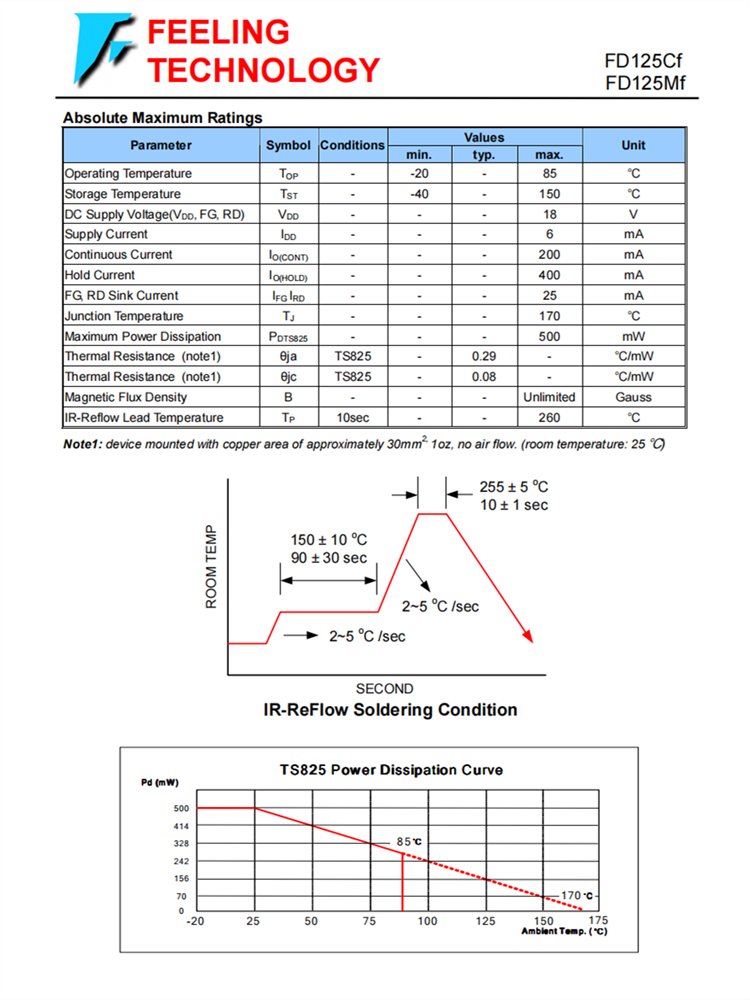 FD125Cf/FD125Mf是一種嵌入式霍爾效應傳感器IC的單相全波電機驅(qū)動器。它集成了h橋MOS驅(qū)動程序,高靈敏度大廳效應傳感器,一個事件計時器轉(zhuǎn)子鎖定,轉(zhuǎn)速表或報警輸出邏輯僅在TS825包,使電機的多氯聯(lián)苯(印刷電路板)設計簡單和制造小型直流電機或風扇盡可能簡單。