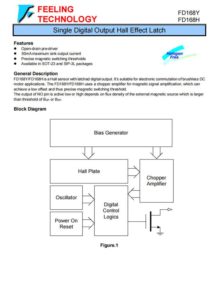 FD168Y/FD168H是一個(gè)具有鎖存數(shù)字輸出的霍爾傳感器。它適用于無(wú)刷直流電機(jī)的電子換向應(yīng)用。FD168Y/FD168H使用斬波器放大器進(jìn)行磁信號(hào)放大,可以實(shí)現(xiàn)低偏移量,從而實(shí)現(xiàn)精確的磁開關(guān)閾值。