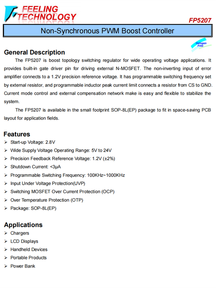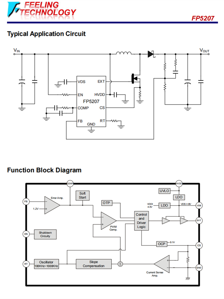 FP5207是用于廣泛工作電壓應(yīng)用的升壓拓?fù)溟_關(guān)調(diào)節(jié)器。它提供了內(nèi)置的門驅(qū)動(dòng)銷,用于驅(qū)動(dòng)外部N-MOSFET。誤差放大器的非反相輸入連接到一個(gè)1.2V的精度參考電壓。它具有由外部電阻器設(shè)置的可編程開關(guān)頻率,并且可編程電感器的峰值電流極限將電阻器從CS連接到GND。電流模式控制和外部補(bǔ)償網(wǎng)絡(luò)使系統(tǒng)穩(wěn)定簡(jiǎn)單靈活。