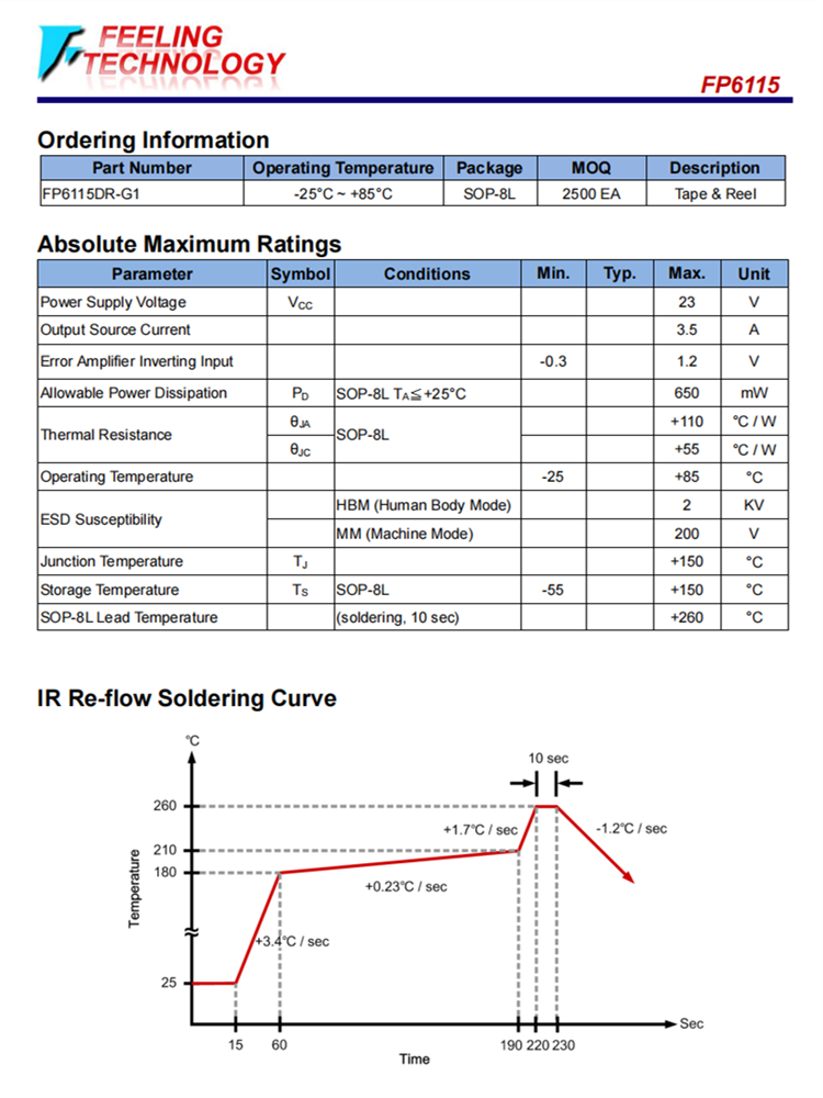 FP6115是一種用于廣泛工作電壓應(yīng)用領(lǐng)域的降壓開關(guān)調(diào)節(jié)器。FP6115包括一個(gè)高電流P-MOSFET,一個(gè)用于將輸出電壓與反饋放大器進(jìn)行比較的高精度參考(0.8V),一個(gè)內(nèi)部軟啟動(dòng)定時(shí)器和死時(shí)間控制器。該振蕩器用于控制最大占空比和PWM頻率。