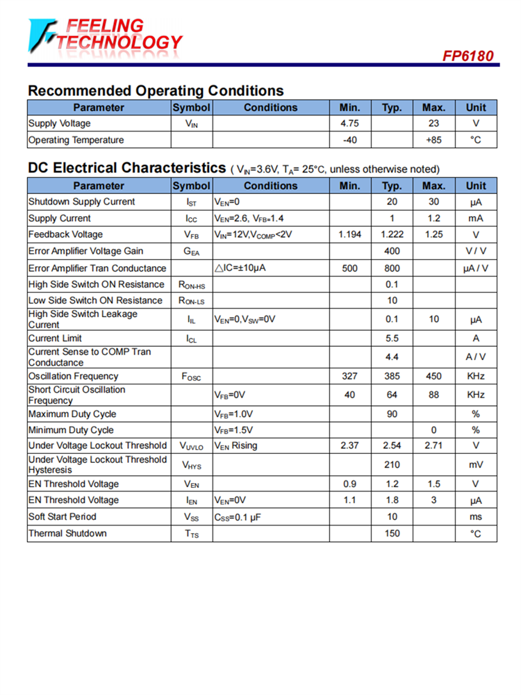 FP6180是一個(gè)內(nèi)置內(nèi)部功率MOSFET。它在廣泛的輸入電源范圍內(nèi)實(shí)現(xiàn)3A連續(xù)輸出電流,具有良好的負(fù)載和線路調(diào)節(jié)。電流模式的操作提供了快速的瞬態(tài)響應(yīng)和簡(jiǎn)化的回路穩(wěn)定。該裝置包括逐循環(huán)限流和熱停機(jī)保護(hù)。可調(diào)軟啟動(dòng)減少了通電時(shí)輸入源的壓力。調(diào)節(jié)器在關(guān)閉模式下只消耗20μA的電源電流。FP6180需要最少數(shù)量的現(xiàn)成的外部組件來(lái)完成一個(gè)3A降壓調(diào)節(jié)器解決方案。