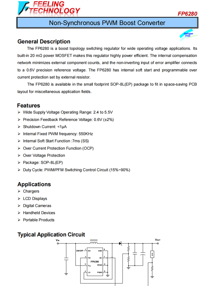 FP6280可在小足跡SOP-8L(EP)包中使用,以適應其他應用領(lǐng)域的節(jié)省空間的PCB布局。