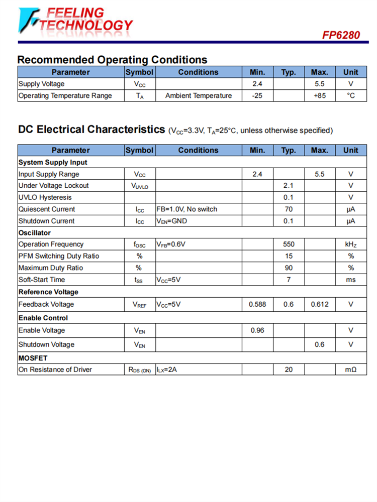 FP6280是一種用于廣泛工作電壓應用的升壓拓撲開關(guān)調(diào)節(jié)器。其內(nèi)置的20 mΩ功率MOSFET使該調(diào)節(jié)器的功率高效。內(nèi)部補償網(wǎng)絡(luò)使外部組件計數(shù)最小化,并且誤差放大器的非反相輸入連接到一個0.6V的精度參考電壓。FP6280具有內(nèi)部軟啟動和可編程的過電流保護設(shè)置的外部電阻。