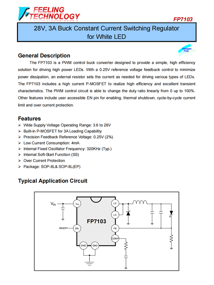 FP7103 28V,3A降壓,白色LED的恒流開關調(diào)節(jié)器芯片