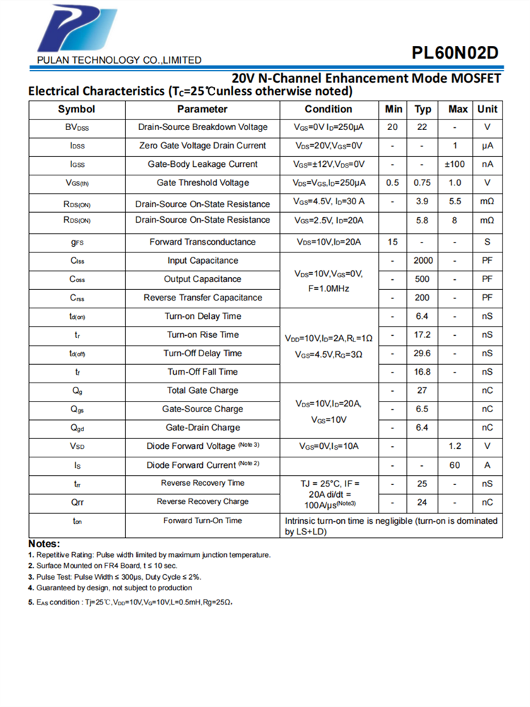 PL60N02D 20VN通道增強模式MOSFET場效應(yīng)管