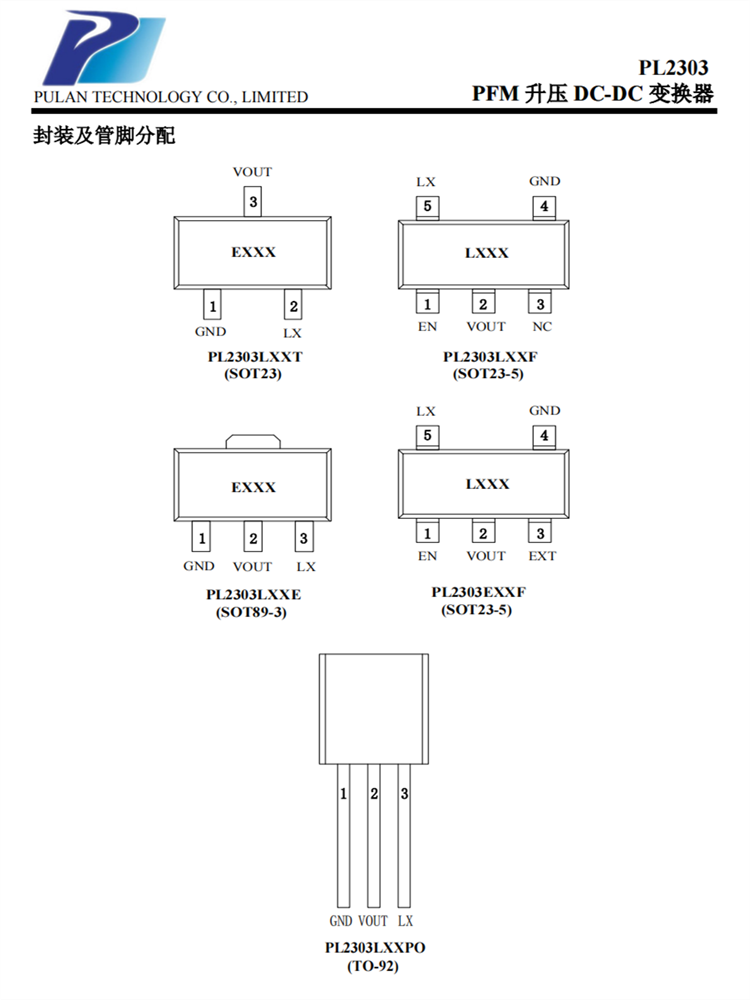 PL2303系列產(chǎn)品總共有四種封裝形式:SOT23、SOT23-5、SOT89-3 和 TO-92。其中,SOT23-5 封裝內(nèi)置了 EN 使能端,可控制變換器的工作狀態(tài),當(dāng) EN 使能端輸入為低電平時(shí),芯片處于關(guān)斷省電狀態(tài),功耗降至最小。