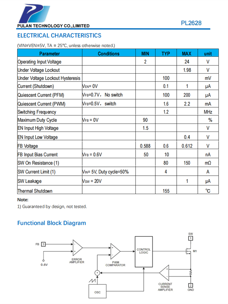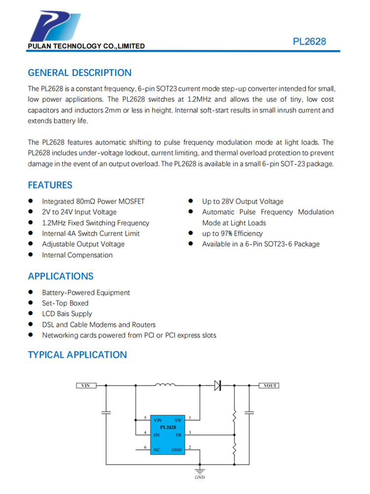 PL2628是一個(gè)恒定頻率、6引腳SOT23電流模式升壓轉(zhuǎn)換器,旨在用于小型、低功耗的應(yīng)用。PL2628的開關(guān)頻率為1.2MHz,并允許使用2毫米或更低高度的微小、低成本的電容器和電感器。內(nèi)部軟啟動(dòng)導(dǎo)致注入電流小,延長(zhǎng)電池壽命。