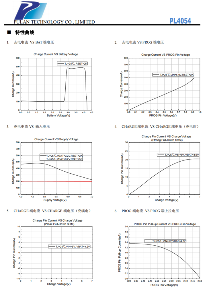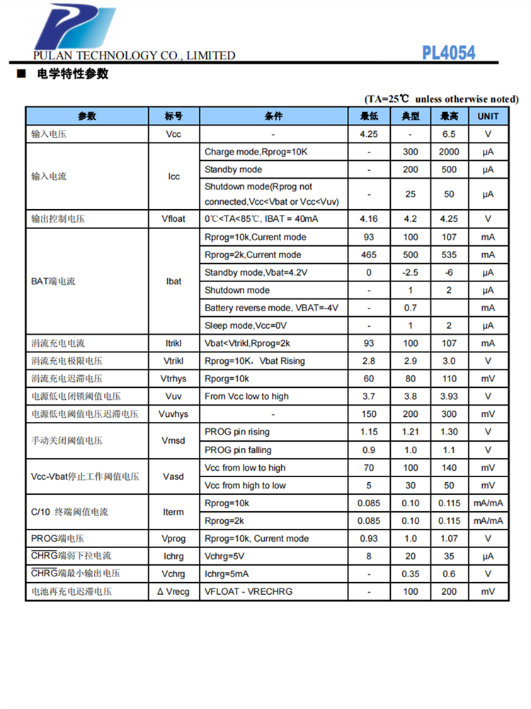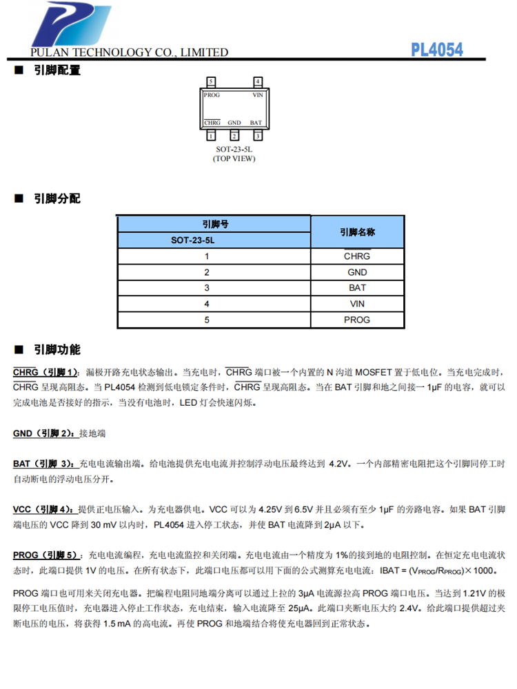 充電電壓被限定在 4.2V,充電電流通過外部電阻調(diào)節(jié)。在達(dá)到目標(biāo)充電電壓后,當(dāng)充電電流降低到設(shè)定值的 1/10時(shí),PL4054 就會(huì)自動(dòng)結(jié)束充電過程。當(dāng)輸入端(插頭或 USB提供電源)拔掉后,PL4054 自動(dòng)進(jìn)入低電流狀態(tài),電池漏電流將降到 2μA 以下。PL4054 還可被設(shè)置于停止工作狀態(tài),使電源供電電流降到 25μA。