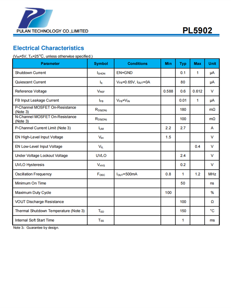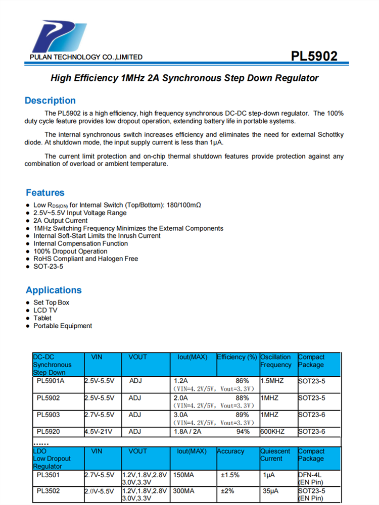 PL5902是一種高效、高頻同步DC-DC降壓調(diào)節(jié)器。100%占空比功能提供了低退出操作,延長了便攜式系統(tǒng)的電池壽命。