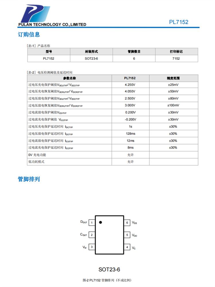 PL7152對每種保護/恢復條件都設置了一定的延遲時間,只有在保護/恢復條件持續(xù)到相應的時間以后, 才進行相應的保護/恢復。如果保護/恢復條件在相應的延遲時間以前消除,則不進入保護/恢復狀態(tài)。當 VM 小于-5V,VDD 從 0V 升高至正常值時,芯片將進入快速檢測模式,縮短延遲時間,并禁止過電流充電保護功能。過電壓充電檢測和過電壓放電檢測延遲時間會縮短到將近 1ms,這能有效地縮短保護電路 PCB 的檢測時間。當 VM 升高至 0V 以上時,芯片將退出快速檢測模式。