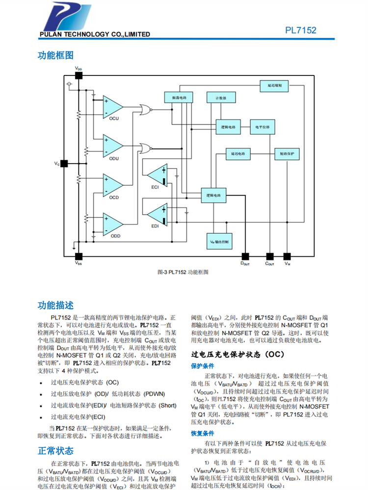 PL7152通過檢測兩個電池電壓來進行過充/放電保護。當充/放電保護條件發(fā)生時,COUT/DOUT 由高電平變?yōu)榈碗娖剑?Q1/Q2 由導通變?yōu)榻刂梗瑥亩?放電過程停止。PL7152對每種保護狀態(tài)都有相應的恢復條件,當恢復條件滿足以后,COUT/DOUT 由低電平變?yōu)楦唠娖剑?使 Q1/Q2 由截止變?yōu)閷ǎ瑥亩M入正常狀態(tài)。