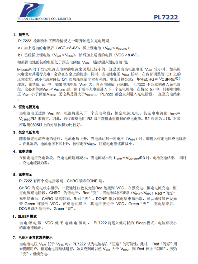 PL7222 通過檢測電池電壓來決定其充電狀態(tài):預(yù)充電、恒流充電、恒壓充電。當電池電壓小于閾值電壓 VMIN(一般為 6V)時,處于預(yù)充電狀態(tài),以較小的電流對電池進行充電,預(yù)充電的電流可以通過外部電阻進行調(diào)整。預(yù)充電使電池電壓達到 VMIN 后,進入恒定電流充電的快速充電狀態(tài),充電電流 IREG 可以通過外圍電阻 R2 調(diào)整,恒定電流充電使電池電壓上升到恒定電壓充電電壓VREG(一般為 8.4V)。然后進入恒定電壓充電狀態(tài),充電電壓的精度優(yōu)于±1%,在該狀態(tài)下,充電電流將逐漸減小,當充電電流小于閾值 ITERM,充電結(jié)束。充電結(jié)束后,將始終對電池電壓進行監(jiān)控,當電池電壓小于閾值 VRECHG(一般為 VREG- 250mV)時,對電池進行再充電,進入下一個充