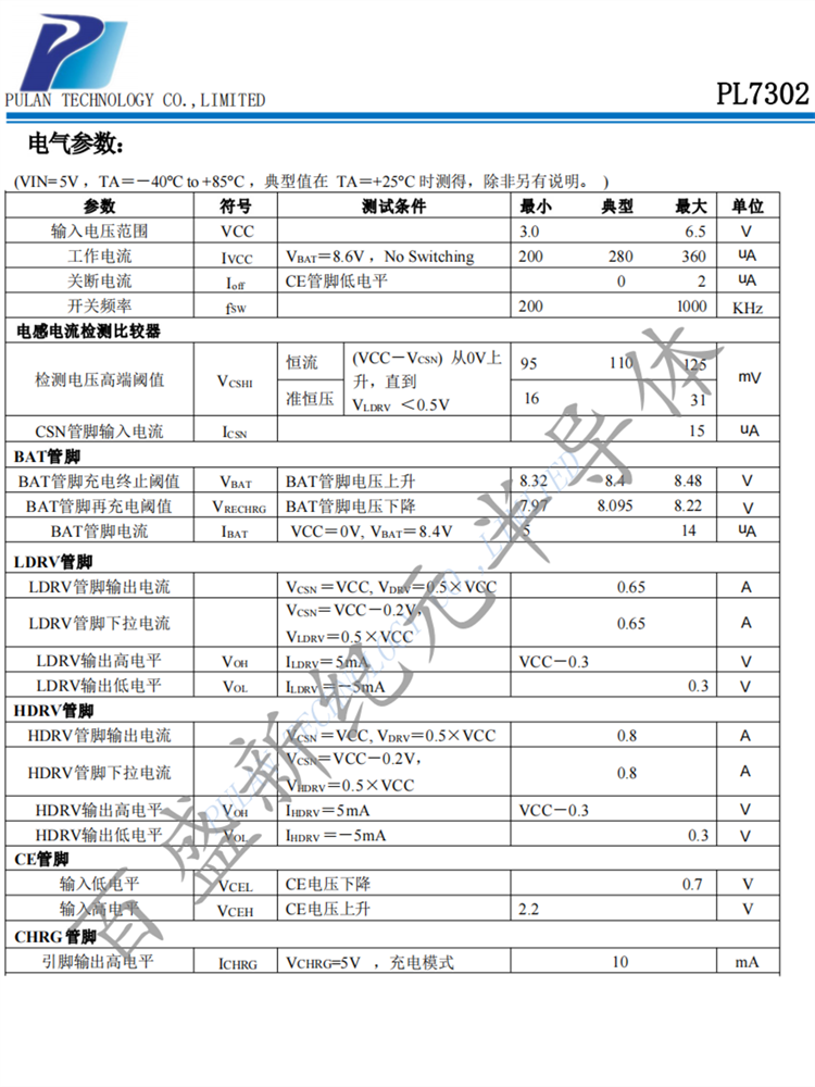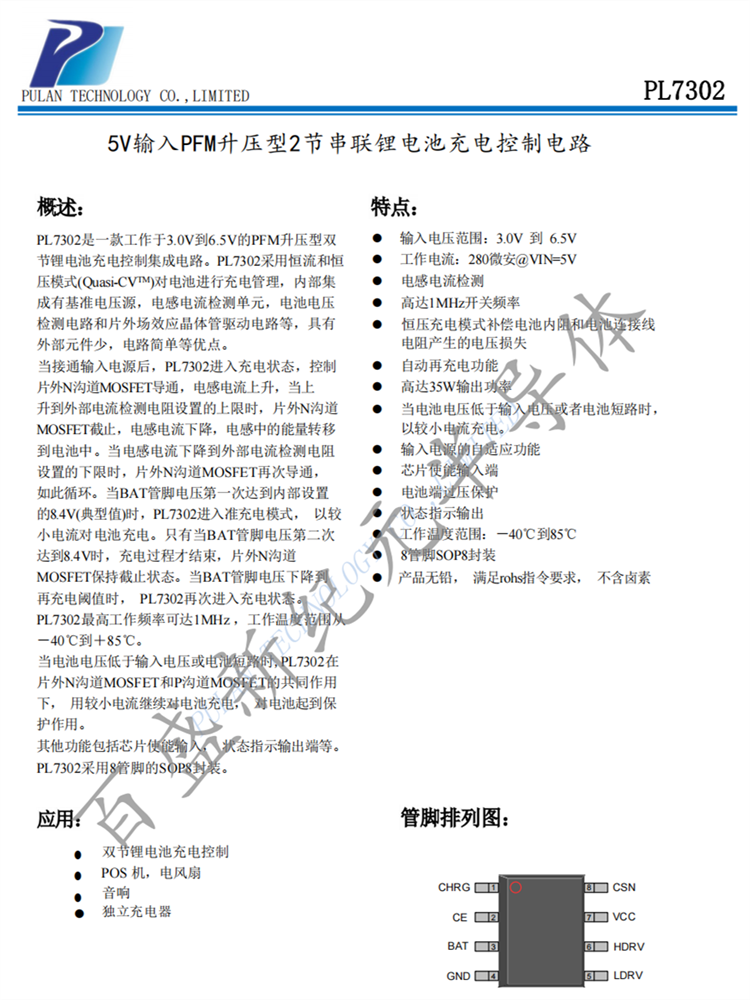 其他功能包括芯片使能輸入, 狀態(tài)指示輸出端等。PL7302采用8管腳的SOP8封裝