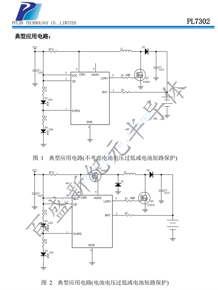 當電池電壓低于輸入電壓或電池短路時,PL7302在片外N溝道MOSFET和P溝道MOSFET的共同作用下, 用較小電流繼續(xù)對電池充電, 對電池起到保護作用。