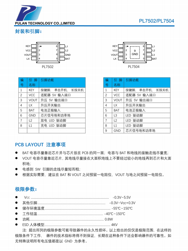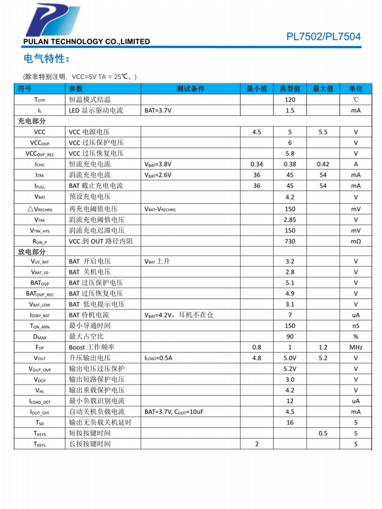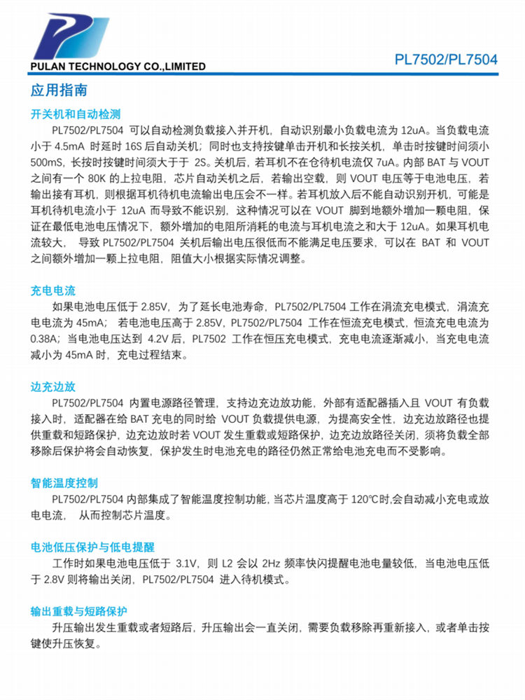 PL7502/PL7504 充電電流為 0.38A,同時(shí)同步升壓轉(zhuǎn)換器支持 0.8A 輸出,支持自動(dòng)開關(guān)機(jī)和按鍵開關(guān)機(jī), 自動(dòng)關(guān)機(jī)前的電流 4.5mA,自動(dòng)關(guān)機(jī)后長時(shí)間待機(jī)電流7uA。