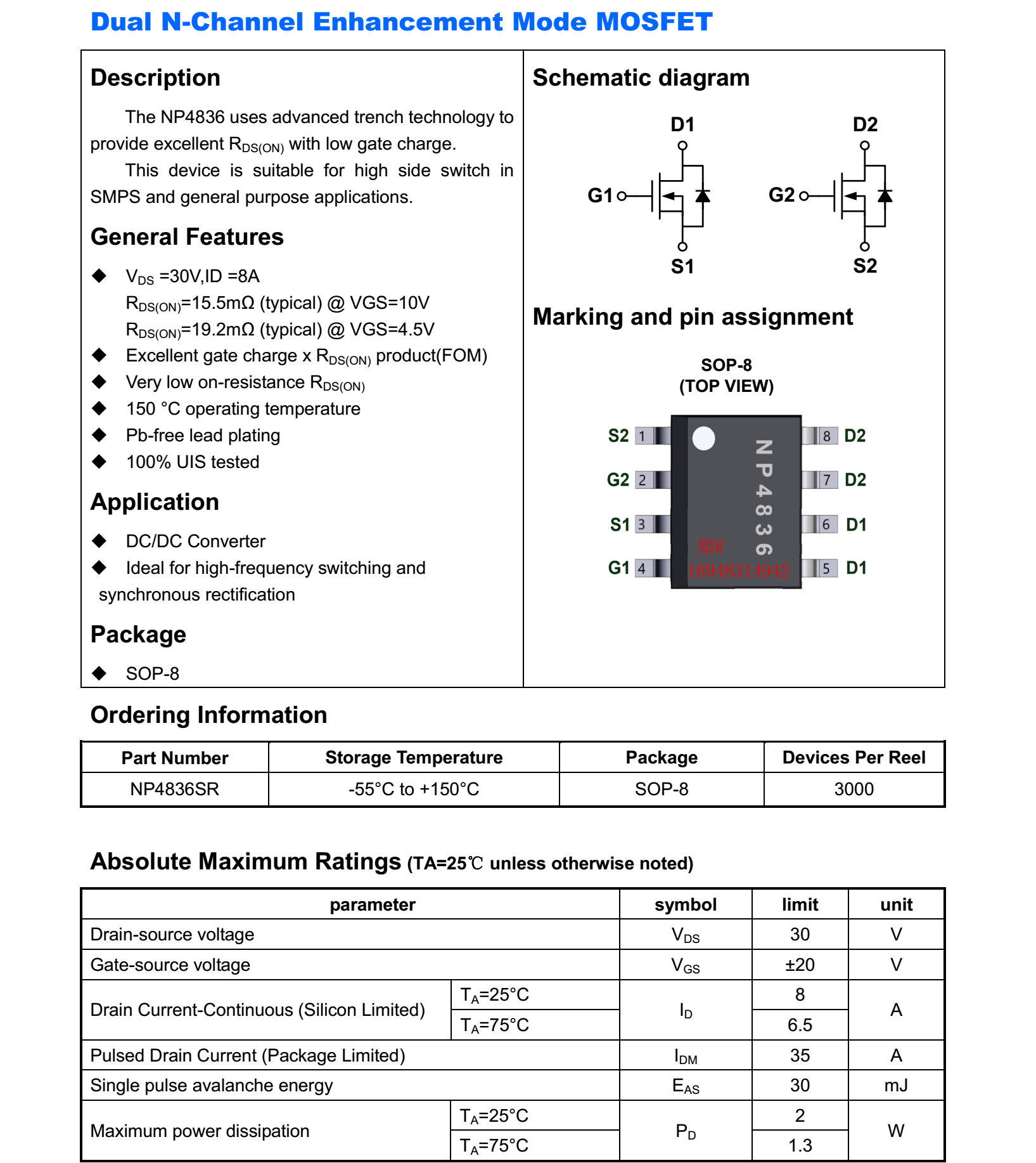 NP4836高VGS耐壓,獨(dú)立雙N溝道MOS
