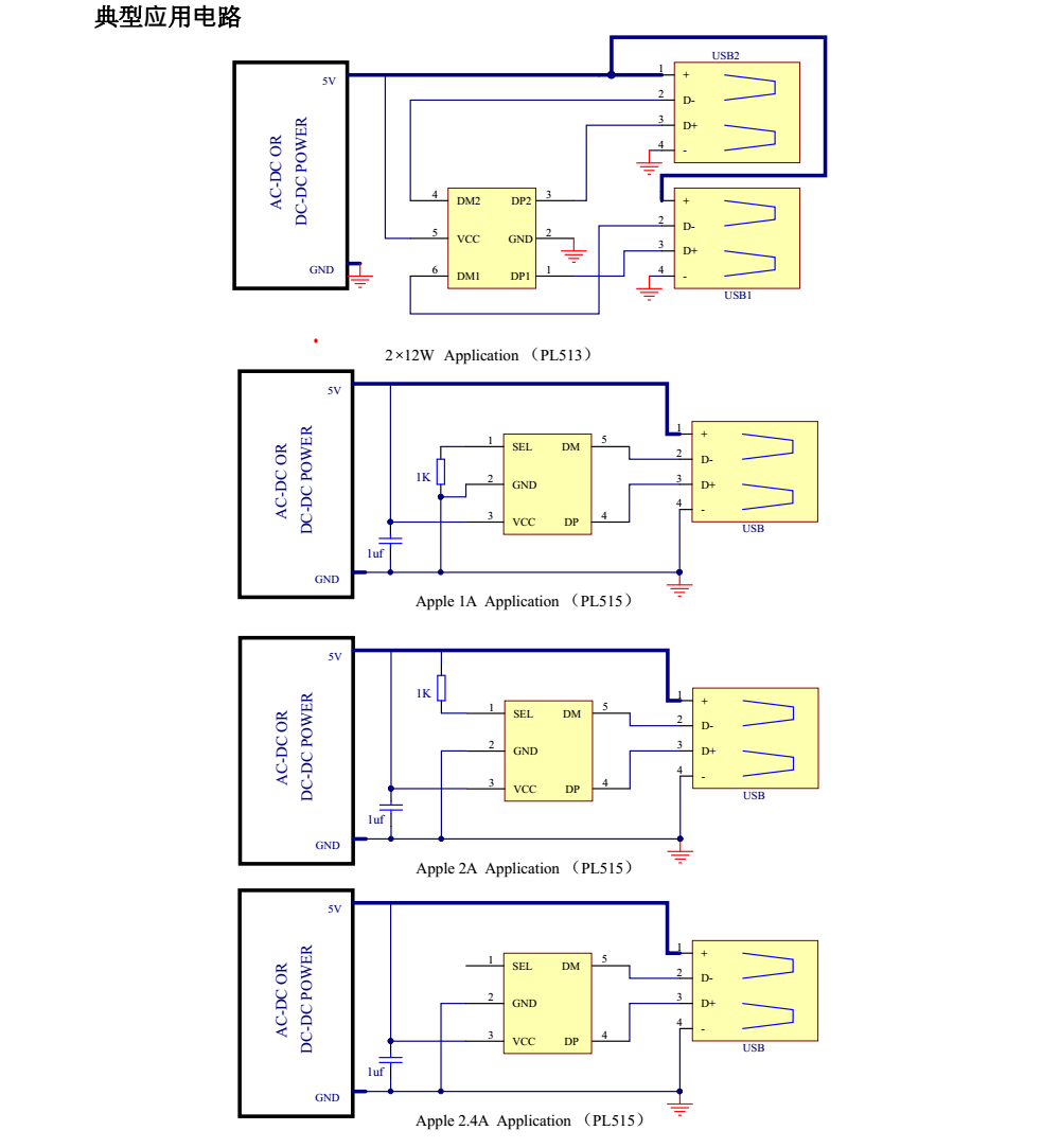 USB智能識別IC,是用來解決傳統(tǒng)USB口的識別電阻,識別電阻做的識別電路,能識別的充電協(xié)議模式比較單一的問題。PL515是集成了蘋果手機和平板(5V1A,5V2A,5V2.4A)的充電識別協(xié)議,三星5V1A,5V2A的充電協(xié)議和BC1.2 DCP的D-/D+短路的充電協(xié)議。應用設計簡單,手機充電設備必備IC。